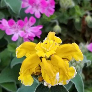 エルサレム・セージ 灰緑色で銀に縁取りされた葉と バターが入った洋食系の色彩のお花が いつ見ても変わった黄花です。
