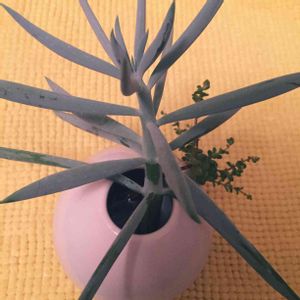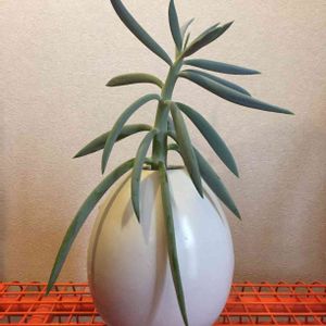 水差しで発根中のセネシオさん。卵型の花瓶に付けておいてたら、淵にぴったり沿うように葉っぱが降りてきた😳 倒れなくてバランス良くなったのは良いが…