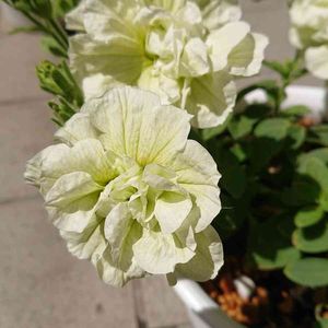 ペチュニア さくらミルク🌸を2株入れた寄せ植えです☺️ アイボリー色にピンクのハート💕のふちどりで、サイズは3センチほど、大きすぎなくてかわいいです。 アイボリー色に合わせてヘリクリサムを入れ、スーパーベナの紫とミニバラの黄色を。葉物はラミウムとワイヤープランツ スポットライトです🌿