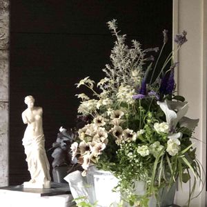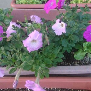 ペチュニアとラベンダーとデイジーと爽やかな葉っぱのんとの寄植え 可愛い色合いやの〜