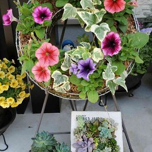 ハンギングリース、夏バージョン!!✨ 冬に比べてあまり長持ちしないけど、リースはやっぱり作るの楽しい😊 ペチュニアだと、ビオラとかみたいに正面向かないから、むずかいな… もりもりなりますよーに!!🥰