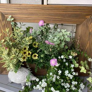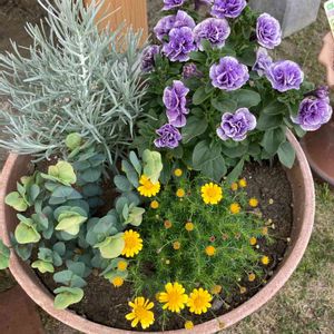 寄せ植え② めっちゃくちゃお気に入りです⚘ ガーデニング2年目の寄せ植え完成✧ ユーフォルビアダイヤモンドスノー 八重のペチュニア オレガノケントビューティー スカビオサ ラベンダーを入れました♪ 鉢もお気に入りです。 敷地も小さく 日当たり悪い我が家ですが 何とか長く咲いて欲しいな♩