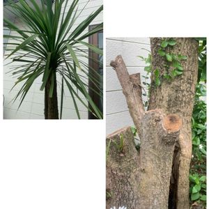 ニオイシュロラン。 先日、4メートル以上の高さを半分くらいにバッサリ切りました。もう30年くらい経つ、うちのシンボルツリーです。 数日前、水道の検針の方から漏水を指摘されました。トイレのタンクから漏水する場合があるから調べた方がいいとのこと。すぐに水道屋さんに調べてもらったら、家の中ではなく、外の水道管から漏れているらしい。エー‼️ひょっとしたらこのシュロの根が水道管に入ったの?と疑われたシュロは私の手によって半分に伐採。根元にウロができるのが特徴みたいで、中を覗くと深い穴が見えます。新築する時に外構をやってくれたおじさんが植えてくれました。洋風の家に合うように選んでくれたんでしょう。 で、昨日水道屋さんがあちこち掘って、漏水箇所を発見‼️修理は無事終わりました❣️しかーし、シュロは無実の罪をきせられてしまった結果に💦ごめん🙇♀️ でも大きくなり過ぎてたから、ちょうどイイくらいになったかな? 隣で生い茂っていたニオイバンマツリも根こそぎ抜いたので、東南の一等地がポッカリ空きました😃💡😃すぐにバラやクレマチスを植えたい💓って言ったら、家人がちょっと待ったらー、だって。 待てない‼️何植えよっかなぁ♫ 水道管は曲がっている箇所が凹んで小さな穴が開いていました。何かに押されたような跡が。この付近の紅葉の根っこか、何かで押されたかも。スコップでキズつけた覚えはないです。でも皆さん、気をつけましょう❣️ 先程、請求書が💦開けるのが怖い😅