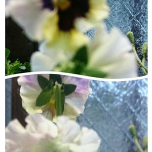 切り花で、洗面所出窓に飾ってる夢見るパンジーが、陽射しを余り受けないからか?色素抜け白色に変身〜裏側と表側の表情ご覧下さいネ。