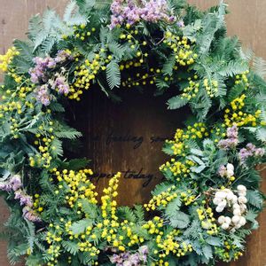 春爛漫カラー✨桃色が入るとまた違った雰囲気です。 今日はミモザオンリーのリースがお嫁に行きました🌿また作らねばっ😆