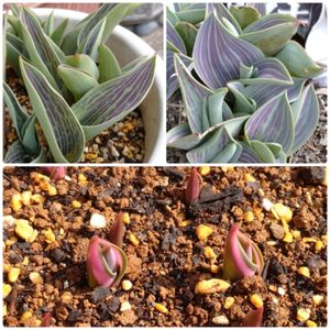 ①プリムラ ワーフェデル スパーブ💞草丈6cm🥰 ②原種チューリップ グレーギー プレジールのストライプの葉(•ө•)💚