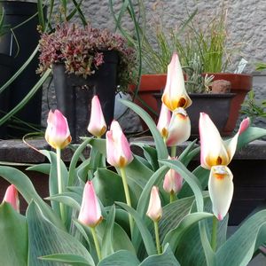 葉の綺麗なチューリップを鉢植えで育てています🌷 左上、原種チューリップ グレーギー プレジール 右上、原種系チューリップ ピノキオ 下、ハッピーアップスター ハッピーアップスターは昨年秋初めて植えたので、成長が楽しみです🌷 やぎ座地方、今日から最高気温二桁になる予報🤗 ミソサザイが苔を咥え車庫を出入りしています🐦️ 今年こそパートナーが出来るといいね♪