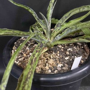 マンフレダ "チョコレートチップ"。 真夏のブラッドスポット シリーズ。第二弾。 二つ目はマンフレダ。 冬場に 葉を減らし、まずいかなと思ったが なんとか葉が増えてきた。 菊鉢に砂主体の用土に植え替えてから 水切れ気味なような感じがしたので、表土にピートを撒いて水もちを良くしました。冬場に葉が減ったのも水が足りなかったせいかもしれませんね。 意外に多めの水が必要な子だと思います。 あと葉がちぎれやすすぎるので、鉢を動かすの大変。