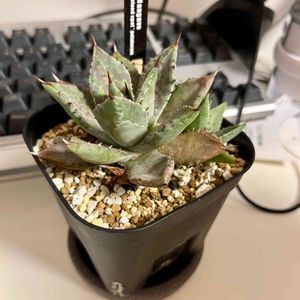 なんか伸びてきたマンガベ どうやら咲く気らしい 久しぶりに曇天のち雨 植え替え後に重量のかかった下葉が 一部傷んだりしていたが新しい葉も出てるなと ぼんやり見ていたら妙に伸びてきた これは花が咲く気らしいとうっすら気づく 10号超えた株でかなり重いとはいえ 花が伸びて屋上の強風で倒れないといい どこかに鉢を固定した方が安心かも 台風来るかもとかいう話なんで様子を見て考える アガベは咲いたら滅ぶがマンガベは滅ばないらしい らしいというのは実際自分で咲いたマンガベの その後を確認した事はないんで半信半疑 あと花茎が中央なんで成長点がどうなるのか 形状変化を心配している 頂点で子株が発生すると厄介 暑さ得意組は変化が起こる 少しクールダウンする夜半の雨