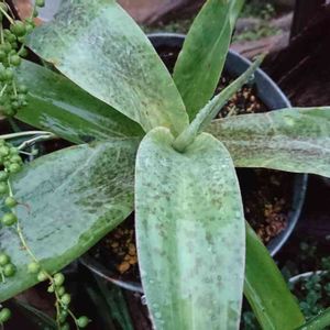 マンガベマッチョモカ。 今年の1月に栃木県の足利フラワーパークで、おつとめ品?的な感じで売られていて破格値の70%OFFで狩ったものです。その時は葉っぱが5枚位で斑点がほ〜んの微かに見えただけでした。 最近になって斑点が濃くなり、バナナのシュガースポットのようになってきました😊。 アガベのような硬さはなく柔らかくてつるつるした葉っぱですが意外と丈夫で〜す。