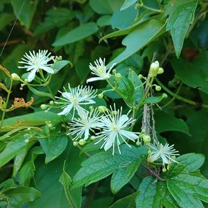 お出かけ先の公園遊歩道に咲いてた白い花 2022.7.31 これが牡丹ヅルかなぁ~😌🌿 葉っぱがゴチャゴチャですが、 牡丹と似てる葉が写ってます✌