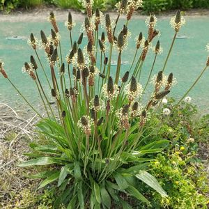 おはようございます😃 🐶散歩の途中で咲き誇る草🐾 🌿ヘラオオバコ🌿 背景の水色、池のように見えるけど防草シート😆 浮かんで見える丸い浮草はシートを止める金具😆