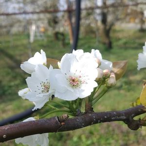 おはようございます😃 🐶散歩の途中の果樹畑に咲いてる梨の花🐾 去年この木に梨がなってました✌ よく見ると蕊がピンク色なんだね💕