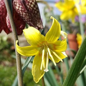 おはようございます🎶 去年フリチラリアの球根の袋入を植えたら黄色い花も咲いたの😲 紛れ込んでたね😆👌 調べたら🔎キバナカタクリ?