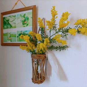 おはようございます⛅ 母の日に貰った壁掛け花瓶に お友達から頂いたエニシダを飾りました💛 20年前に飼ってたワンコのプー太郎と一緒に😌 🏷日曜はビタミンカラー