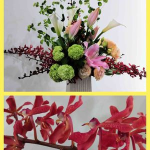 〜 今週の会社のフラワーアレンジメント✨ 〜 今週は色も形も素敵な洋蘭「アンブラック」に目が釘付けに🤩 拡大しないと素敵さが伝わらないと思ったので2picにしました🎶 今週の花材は、アンブラック、ビバナーム、ブプレリウム、ユリ、カラー、トルコキキョウ、隠れてるけど背面にモンステラの葉っぱ です✨👏 アンブラックがワインレッドなので、🏷真っ赤な火曜日 に参加させてください🤗