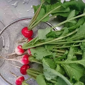 2月28日種まきしたラディッシュの試し採り 赤いキレイな色🍴 大きいので直径3センチで小さいのは1,5センチ程です💦