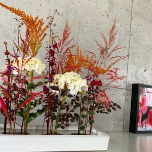 9月の生け込み お祭りの賑やかな人混みの雰囲気を色や形大きさの違う花の間を詰めて表現してみました。