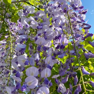わが家のシンボルツリーは藤 地植えの立木仕立てにしてから10年超 昨年バッサリ詰めましたが綺麗に並んで咲きだしました 咲き進むとこの倍くらいの長さになって風に揺れあま〜い香りが、、🐝🎶 #黒龍藤 #ノダフジ系