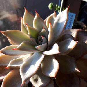 おはようございます☀ 鳴き声の喧しい鳥のおかげで早起き出来ました😭 せっかくなので何かします(笑) 突然ですがみなさんは 「白い風船」 というお菓子をご存知ですか❓ 私の場合は長い事記憶の彼方に消えておりましたが、つい最近生協のカタログで発見し懐かしさに思わず注文してしまいました(>艸<。) 届いて食べてみたら美味しいこと❣️ そうそうこの味〜❗️懐かしい〜、と一気に色々な記憶が蘇りました😊 食べて応援しないと無くなってしまうから、これからもちょくちょく食べたいと思います🎶 前置きが長くなりましたが朝イチpicは 「めぐりあい銘株」 ようやくこの手にできた、念願のざわわ交配です。 もう今回は、ざわわ交配ならなんでも良いからひとつだけ持ち帰りたい❗️と祈る様な気持ちでいた所、待っていてくれたのがこのエボニーサリトレラ×ざわわさんでした✨ 改めてみなさんが追い求めるお気持ちが分かります。 おらいさんは偉大だなぁ…❗️ ぜひこれからも、素晴らしいエケベリア達を作出し続けて欲しいです٩(ˊᗜˋ*)و