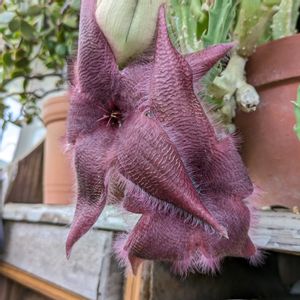 室内の鉢たちに水やりしてたら★こんなのがイキナリ咲いててびっくり!😱 え〜〜!こんなのうちに有ったんかい!😲 同じガガイモ科の蛾角と並べてましたが、しょっちゅう🌼咲いてる蛾角と比べ存在感が全く無くて完全に忘れてました😅 ラベルをみると2018年4月21日に購入し、どこかのタイミングで3鉢に株分けしたのの生き残りの一鉢のようだ😓全く記憶にない… GSにも投稿して無いので★花もはじめて咲いたようだ?😔 ★花は特に匂いはなく👃細かい毛が生えていて、その毛が微風にも揺れて何だか生物感がすごい😓 まるで動いてるようでちょっと気持ちが悪い😅 しかし7年半近く存在感を消しているとは、ある意味すごい植物なのか?私の記憶力がなさ過ぎるのか?😅 ☀☀☀