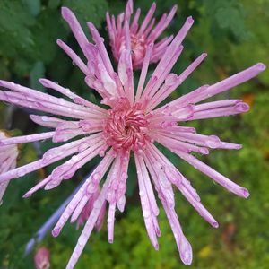 おはようございます😃 🐶散歩の途中の畑に咲いてた菊💞 細い筒状花に雨粒が綺麗でした😌 🏷0の付く日は雨粒の日
