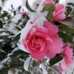 おはようございます😃 今季2度目の雪が降りました❄ 雪の中綺麗に咲く山茶花と💗 雪の中赤く色付く苺に🍓 困難に立ち向かう勇気100%