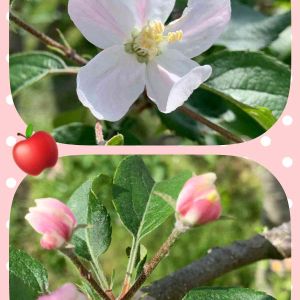りんご🍎の花が咲きました🌸💕 今年枝打ちをしていたので、心配しましたが、生きてました💕 芽が出て🌱、膨らんで、花が咲いたら〜🎶 美味しい🍎ができますように🤞🥰