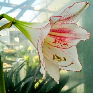 今日のお花🌼 アマリリス💟 ヒガンバナ科 アマリリス(ヒッペアストルム)属💠 植物園温室の個性的なアマリリス三種 会社の前のお宅🏠️の鉢植🪴 昨年からの花が今年も咲いたようです🎵