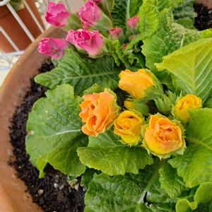 開花が遅い方の鉢。 真ん中のプリムラフリル咲きパーティドレスが綺麗に咲きました🌸 周り4株は早めから咲いているバラ咲きジュリアンです🌹