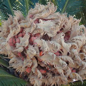 蘇鉄の雌花の中に赤い実を発見 ウネウネした綿毛のような神秘的な花です