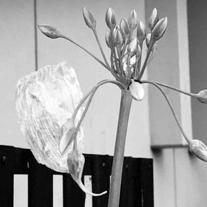 先日はモノクローム加工でお目にかけたアリウム・シクラムですが、1番目の花が下に垂れ下がってきて少し色付きました。どこまで濃くなるでしょう。 2番目の蕾、包まれていた薄皮が割れました。 やっぱりアリウムはネギの仲間ですね。