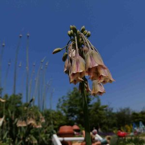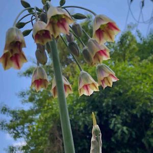 アリウム シクラム 昨日、全部の蕾が1枚の薄皮のような膜で覆われていました。 脱皮したくても天辺の蕾に薄皮がくっついて脱げないの。 一晩頑張れば脱げるかな? 今朝見に行ったら、まだ脱げなくて困っていたので取ってあげました。 これから、この蕾が膨らむと垂れ下がってきて花が咲きます。 もう少し🤏です🎶
