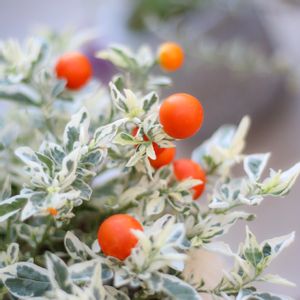 斑入り冬珊瑚 ‘スノーサンゴ’ 別名 タマヤナギ/タマサンゴ ナス科ナス(ソラナム)属 常緑低木ですが、耐寒性がないので、一 年草として扱われています。 涼しげです。実は、12月まで楽しめる様 ですが、毒があるそうです😱