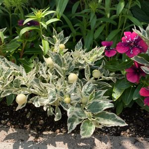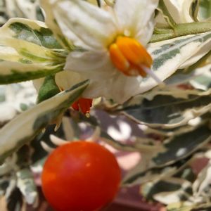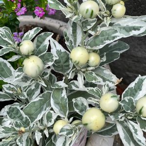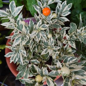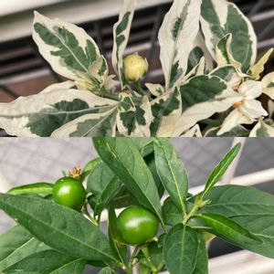斑入りソラナム スノーサンゴの白い花🪸➡️丸い実がなりました➡️全体像です 🏷️2のつく日は斑入りの日 🏷️斑入り見つけ隊♪ 🏷️白い水曜日♡ 今日から毎日斑入りの日🌿斑入り週間🌿ゆる〜く楽しく✨…