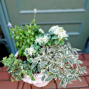 ブルーサルビア サリーファン スノーサンゴ斑入りソラナムとヘデラの寄植え 空いていたスペースに ユーフォルビアハツユキソウを植えました。 今は切り戻して地味めなサルビアを カバーするのは斑入りリーフたち🌿🌿