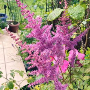 アスチルベ モフモフも雨でしっとり☔️ 後ろに隠れたピンクの薔薇は… パレードかなぁ…❤︎(。☌︎ᴗ☌︎。)