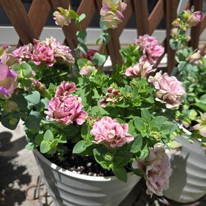 いま咲いてくれてる 八重のペチュニアを撮ってみました📸✨ Page1 ホイップマカロン・クラシカルチェリー🍒 (右) ミンティパフ🌿(左) 仲良しモードで咲いてくれていて微笑ましい感じでした🌱🎶🌱🎶 クラシカルチェリーは結構調子よく咲いてくれてます。 ただ、思い切った切り戻しをしてないので自由な感じになってますけど、元気そうなので全然オッケー🤩👍 Page2 ホイップマカロン・レ・ミルティーユ✨ クラシカルチェリーにかなり似てます😙 こちらの方が若干淡い感じかな〜って思います🤔🎶 このミルティーユも若干下の方はホネホネになりながらも横に広がりながら咲いてくれてます💐🎶 プレミアムカラーのホイップマカロンは花の陰影が美しいものが多いです✨✨ 更にもうちょっと簡単に育てられるともっと良いんだけど😅💦 ちなみに、ホイップマカロン・ピスタチオベリーは私の失敗で鉢ごとひっくり返し半日陰で休養してます🌱💨💨💨💨 Page3 ホイップマカロン・ショコラブラン🍫 一回調子が悪くなって、 「ヤバいなぁ…」 って感じだったんですけど、一か八か半分以上バッサリカットしてから、少しずつ復活してきてくれます😉🎶 苗の調子が悪くなる時は、何らかの原因で根っこの状態が悪くなってる事が多いような気がするので、そこで花や枝葉がモサモサ多いと隅々まで栄養が行き届かなくなって枯れたり、弱ってしまうのかなと勝手に思ってます🤔 なので、バッサリ切り戻しすることで上部の枝葉を減らして苗自体の負担を軽減しリスタートして貰う狙いがあります🌱🎶 なので最近は調子が悪くなりこのままだとヤバいなぁって苗を思い切ってガッツリ切戻しする事をしたりしてます✄✄✄✄✄ 一か八かなんで、それでも駄目な時は駄目なんですけど😅💦💦 ホイップマカロン・プレミアムカラーシリーズは切戻しがあまり得意でないことは知っていたんですが、今回はたまたま運が良かったのかも😜✌️ Page4 ティーパーティー・ルフナ☕ これは、ホイップマカロン・ショコラブランに似てます😙 ルフナのほうが少しお花が大きいかな。 あと良く咲いてくれます💐🎶 (これ大事です🤩) セールにて100円でお迎えしたのが信じられないくらいの元気さでたくさん咲いてます🎉🎉🎉 Page5 ホイップマカロン・ビターロッソ🌹 やっぱりこの花色は好きだなぁ🎶🎶 美しいのに加えて御上品🌱✨✨ このお花が咲いてると、一段とお外の華やかさ加減に違いが出ます🌟 華のある素晴らしいペチュニアです🌹✨✨