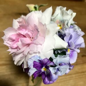 昨日咲いたリラと今日買ったビオラの花を摘んだので一緒に挿しました。