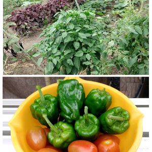 ピーマン 握りこぶし大が6個 苗は スーパーで購入した88円のものです すでに元はとれましたか?🤭👛 無農薬 無施肥 たま~に虫を捕獲するぐらい 全く手間もかかりません😄👍