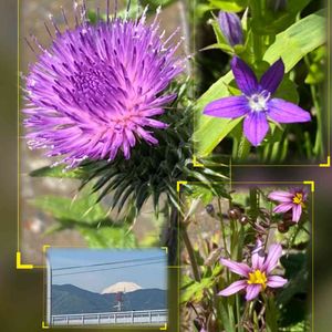 こんにちは☀️ 春は 富士山が霞む事が多いのですが😅 自宅付近の跨線橋から綺麗に見えます🗻 アザミ💜 キキョウソウ💜 ニワゼキショウ💖 雑草と呼ばれるお花ですが…可愛い💕 通院途中の、出会いです❣️😍
