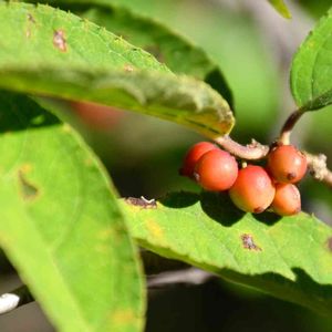 「ウメモドキ」 五年以上になります。🐦️野鳥の冬の餌さ用として二本植えました。沢山の実をつけてます、秋に向かい心なしか色がついてきました。晩秋には真っ赤になります。野鳥は来てますが📱には写す💪が無い👴