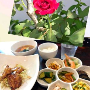 ①父の病院終わりに一緒にランチ🥗🍜 日替わりランチですが、品数が多くて豪華でした🥢😋 最後にはデザートも🍨💞 ⬆️ 店先で咲いていた真っ赤な薔薇🌹 ②こちらもお店の前で可愛らしくお迎えしてくれていたフェアリースター❇️🌸💮🌸❇️ 奥には花手水も🫧🤗 ③実家で咲いていたピンク色の薔薇🩷