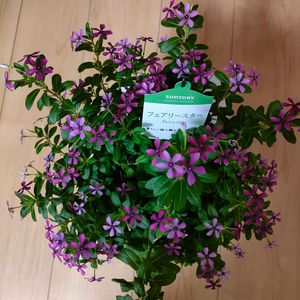 フェアリースター 一年草 ・極小のニチニチソウ 花径1.5cm 耐寒温度 約5度 ・花柄摘みは不要だけど土の上のものは取り除く ・過湿を嫌うので水の与え過ぎには注意し、土が乾いたらたっぷり水を与える🌱 ・花色はブルーになると思いますが、赤紫色で濃いもの、薄い青みがかったピンクなど1鉢の中で色々楽しめます✨ サントリーフラワーズ