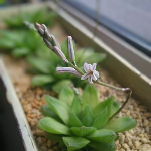 ハオルチア「京の華」 咲き始めました 花芽10本! 白花で小さいので おとなしめですが 元気に咲いてくれてます!