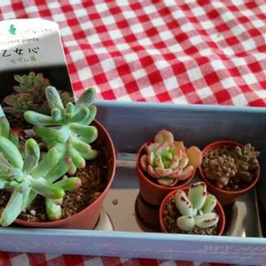 乙女心がシワシワに... 多肉さんは乾燥気味にしないと...と購入してから1度も水をあげてないから水不足かなー? 太陽に当てすぎて葉焼けかなー? 100均パウンド型にこの4つを植えようと思ってたけど乙女心だけ別にしようかな😅
