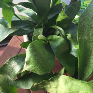 コウモリランの緑の葉が一部縮れ、茶色くなってきました。日照不足かしら、越冬できるか心配です。