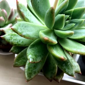 どなたかご存知の方いたら教えてください!手前の緑と赤の子です。購入時はエケベリアとしか記載ありませんでした💦