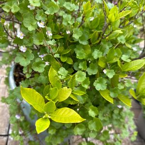 クチナシ、たくさん葉っぱがついてるけど一部黄色い… スリット鉢を初めて買ったので、すがやはり素敵には程遠く自分で水色系のニュアンスカラーでペイントしましたが、まぁ、スリット鉢はスリット鉢でしかないな…笑 となりました で、それを隠すべくグランドカバーとして一緒に植えた子(名前忘れたので教えてください💦) これが強風に煽られたりしてまるでクリスマスツリーのオーナメント的にクチナシベースに絡まり花を咲かせました しばらく愛でていましたが流石に覆い尽くされては困るので上部をカットします