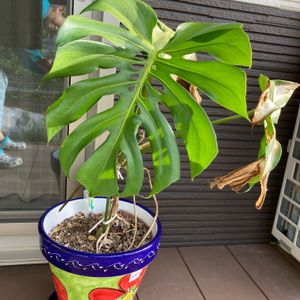 こんにちは 今日もいいお天気です。☀️ 外にほかりっぱなしのモンちゃん。🌿 葉焼けがひどくなっちゃったので、軒下に移動したら、またまたキレイな大きな葉っぱが出てきました。ヨカッタヨカッタ♡ 葉焼けしちゃった葉っぱは切った方がいいのかな? どなたか教えてもらえませんか? 冬はやっぱり中に入れた方がいいのかな? 🏷もう木曜日⁈